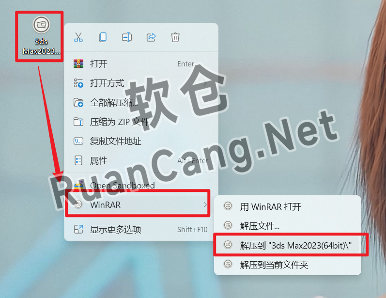 1.鼠标右击【3ds Max2023(64bit)】压缩包(Win11系统需先点击“显示更多选项”)选择【解压到 3ds Max2023(64bit)】。