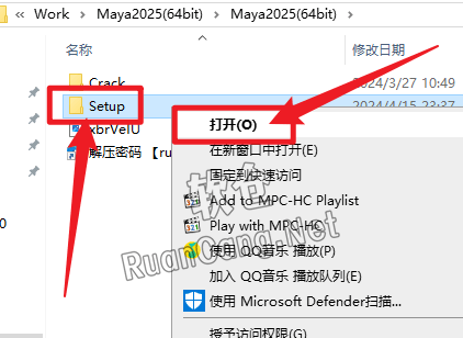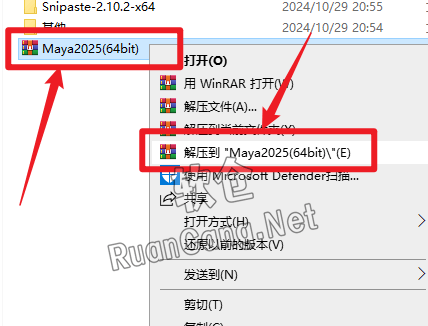 1.解压安装包:①鼠标右击【Maya2025(64bit)】压缩包②选择电脑上安装的解压软件(如:360压缩)③点击【解压到 Maya2025(64bit)】