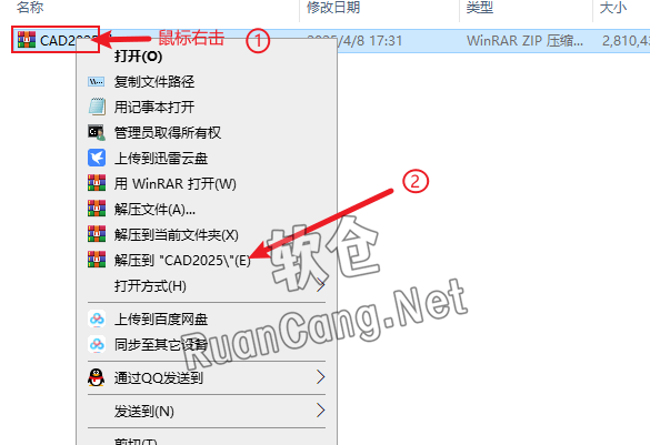 1.解压安装包:①鼠标右击【CAD2025】压缩包②选择电脑上安装的解压软件(如:360压缩)③点击【解压到CAD2025】。